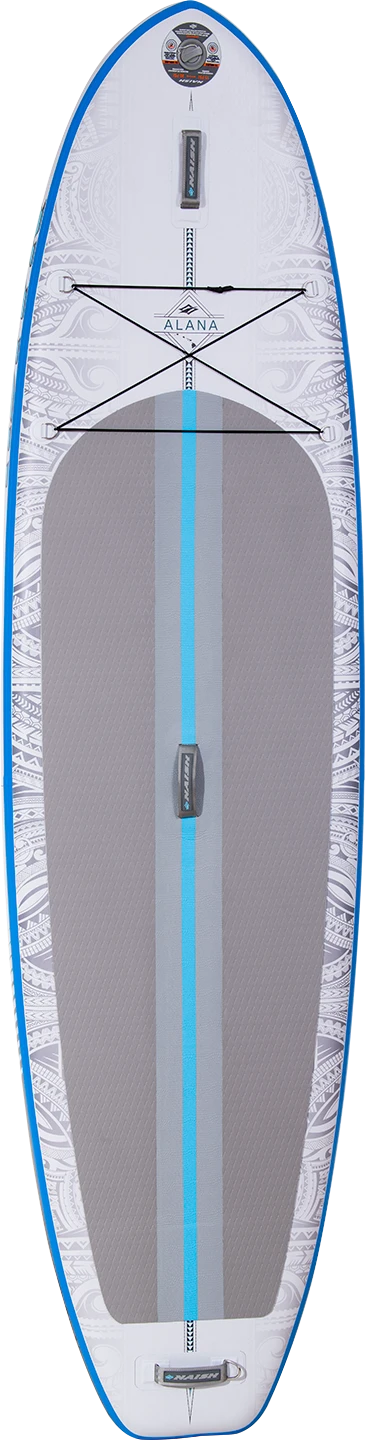 Designed with female paddlers in mind, and based on the Nalu Inflatable Fusion, the Alana is a great all-around choice for riders of all levels and sizes. The Alana Inflatable Fusion boards were designed for all-around fun for the whole family, recreational touring, and longboard-style surfing in small waves. These boards offer stability and an incredible stiffness-to-weight ratio as a result of our high-pressure X-weave material. Fusion construction and 6” thickness further enhance stability for paddling performance similar to a composite board. With its lightweight construction and classic longboard outline, this board is fun to maneuver when cruising around or walking up to the nose on small waves. Ample room on the nose allows for kids to climb aboard, or to store some extra cargo with the cargo strap. The Nalu’s pack a lightweight, stiff, and durable construction into a fun and easy-to-use shape, making SUPing enjoyable from the first stroke.